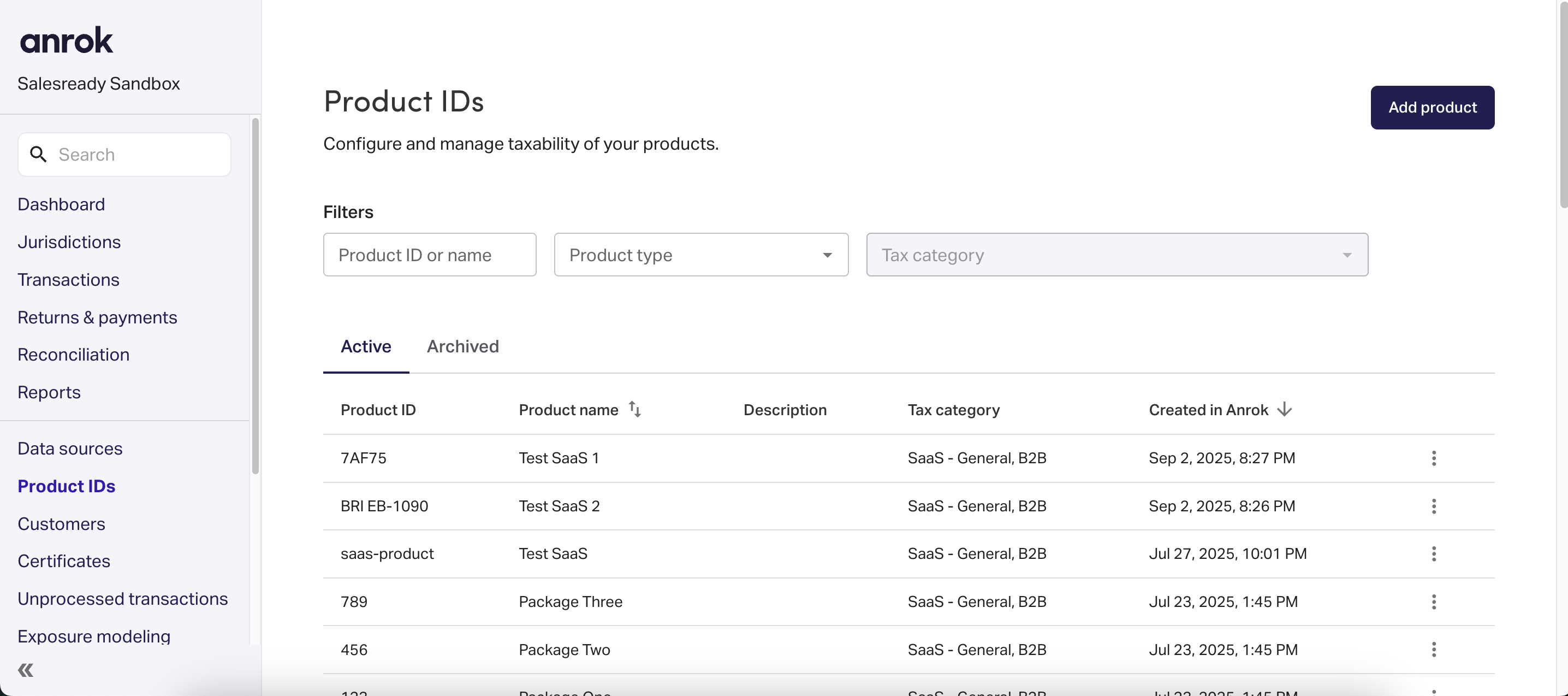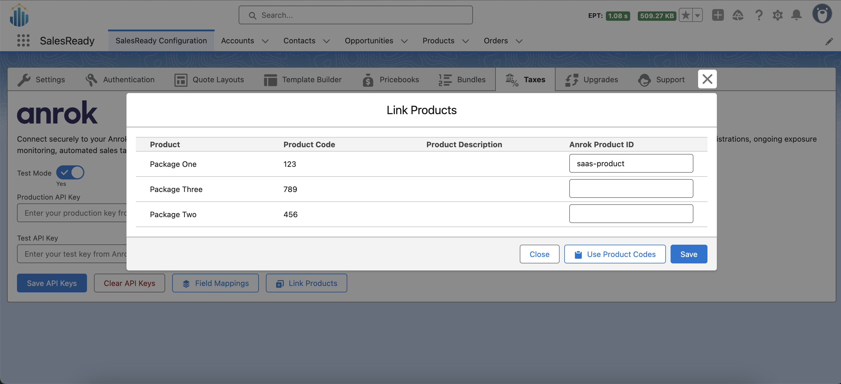 on this screen do not have to match. However, it is a best practice to make them the same. The Use Product Codes button helps easily copy and paste those IDs.SalesReady & Anrok Product Mappings