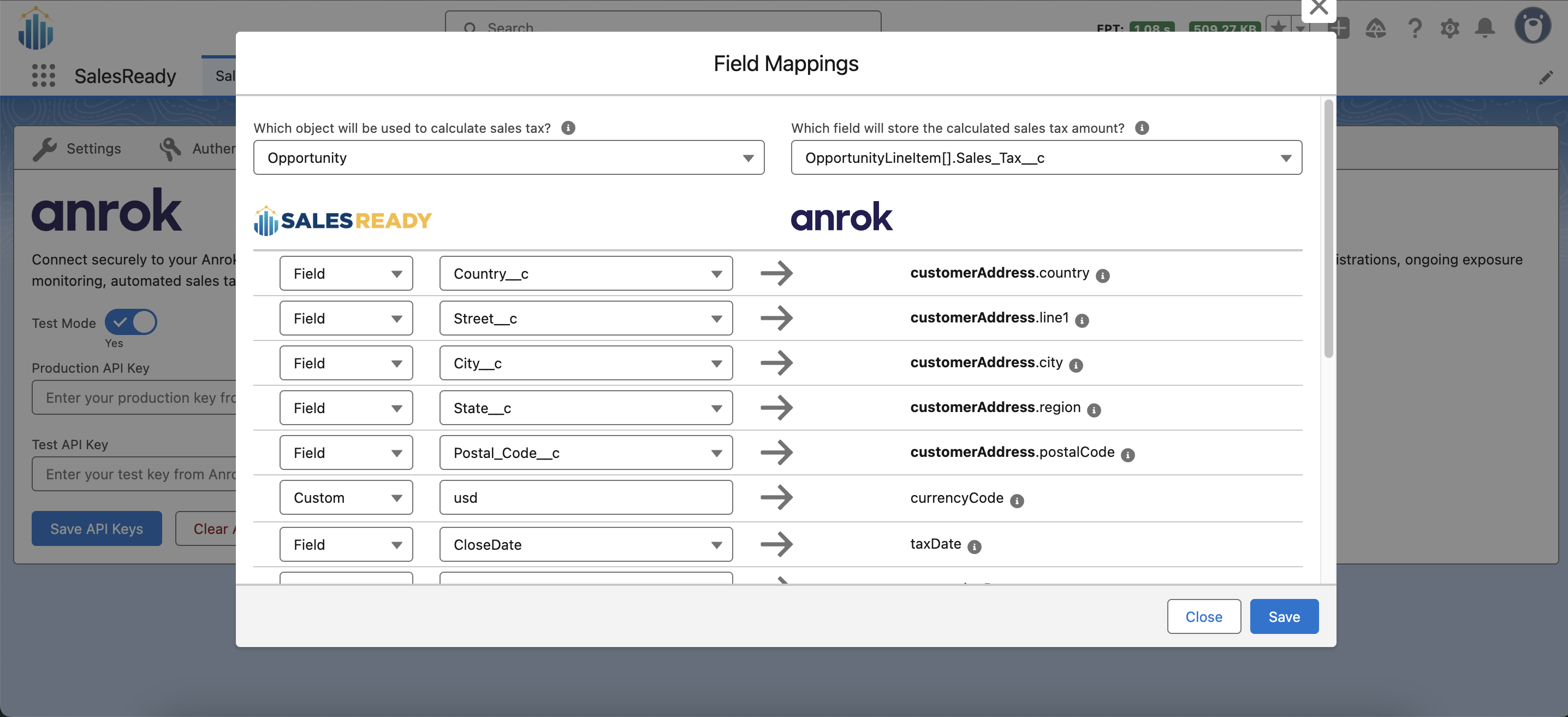 on the OpportunityLineItem. ⚠️ This field does not have to exist on the layout in order for SalesReady to capture the calculated sales tax. However, it must be applied in this step.Choose your Salesforce field to map to Anrok.