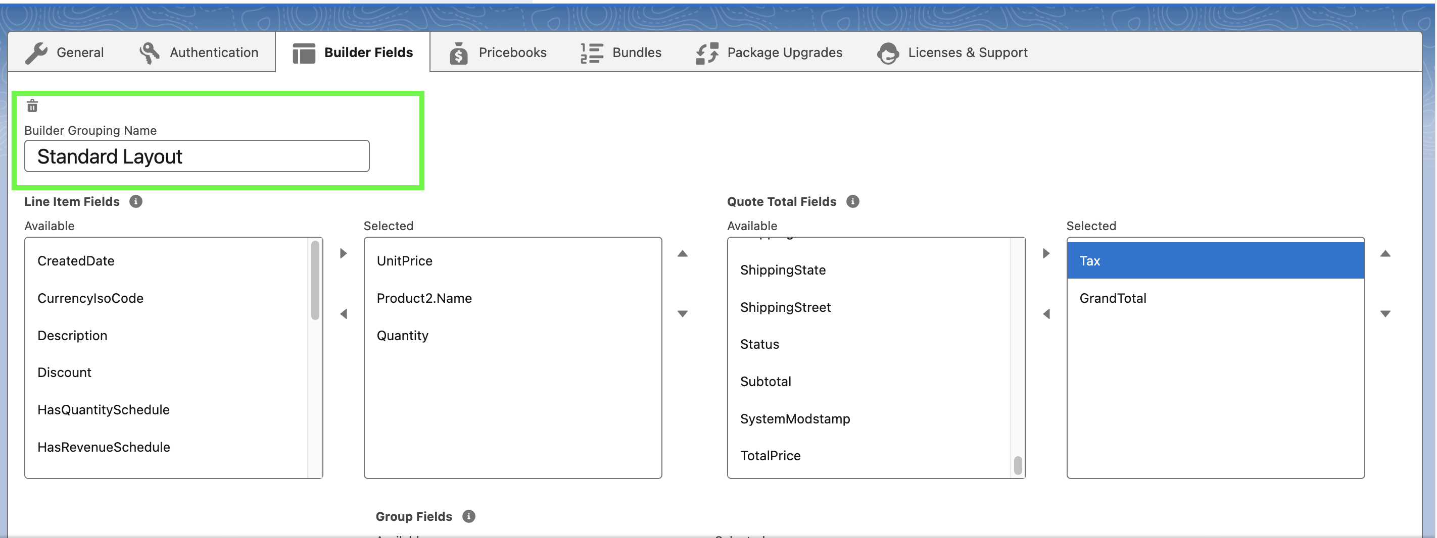 You can reorder selected fields by clicking on a field and using the up and down arrows on to the right of the group to move the field up or down in the order of fields. This will change the order in which the fields appear on the quote