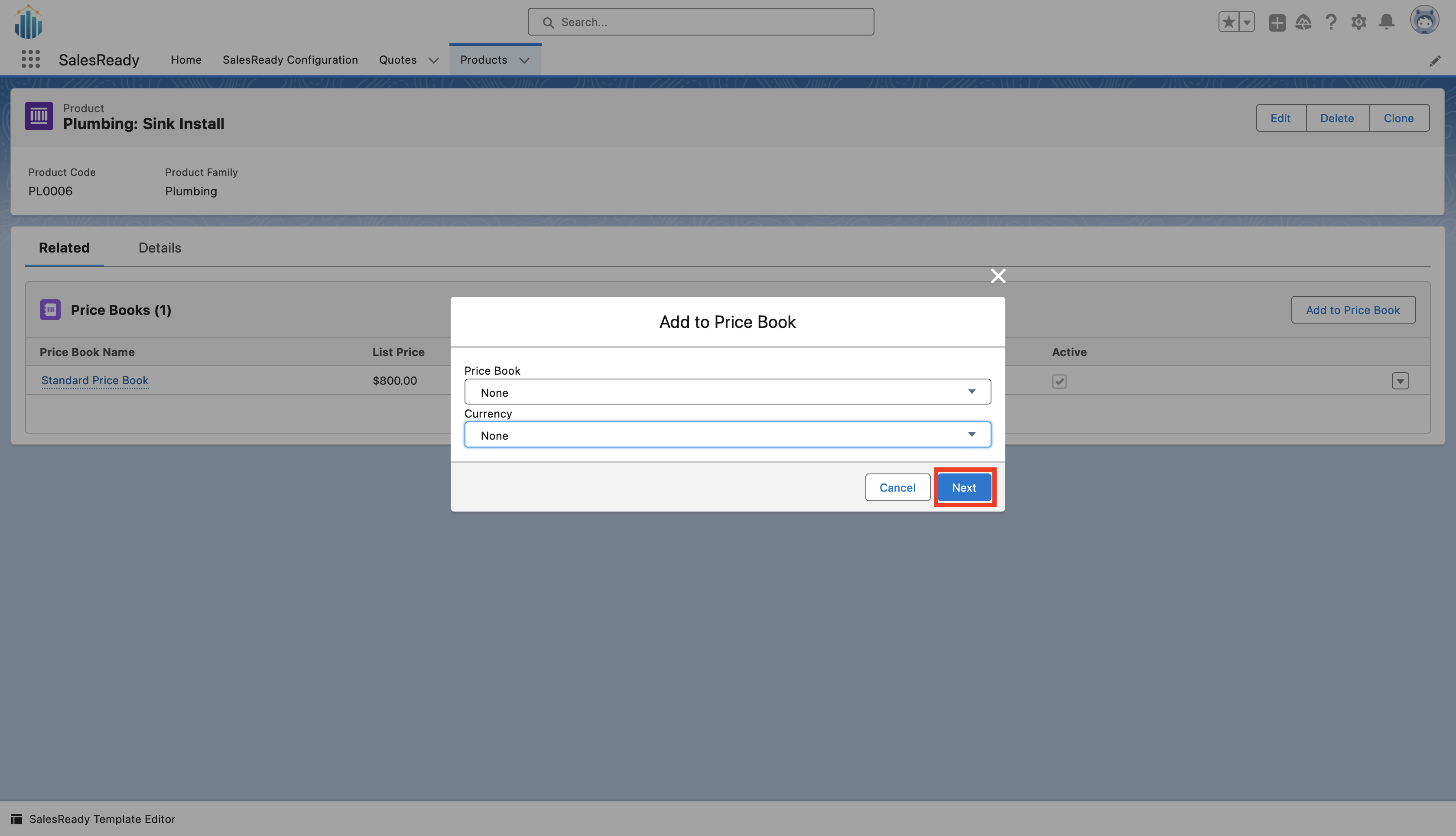 Select the pricebook you want to add to using the “Price Book” drop down and select the currency you want to use using the “Currency” drop down. Press “Next” to add the to the price book.