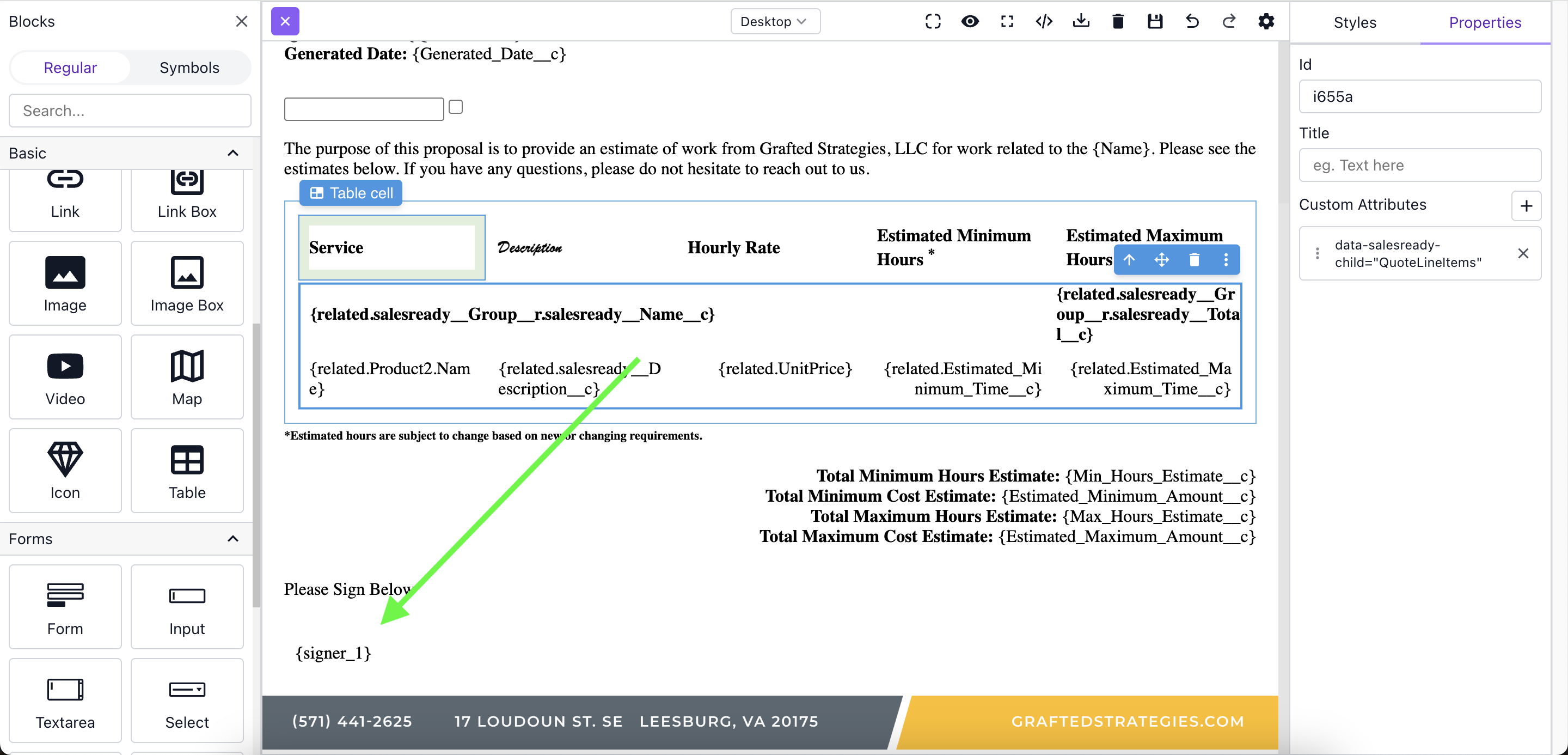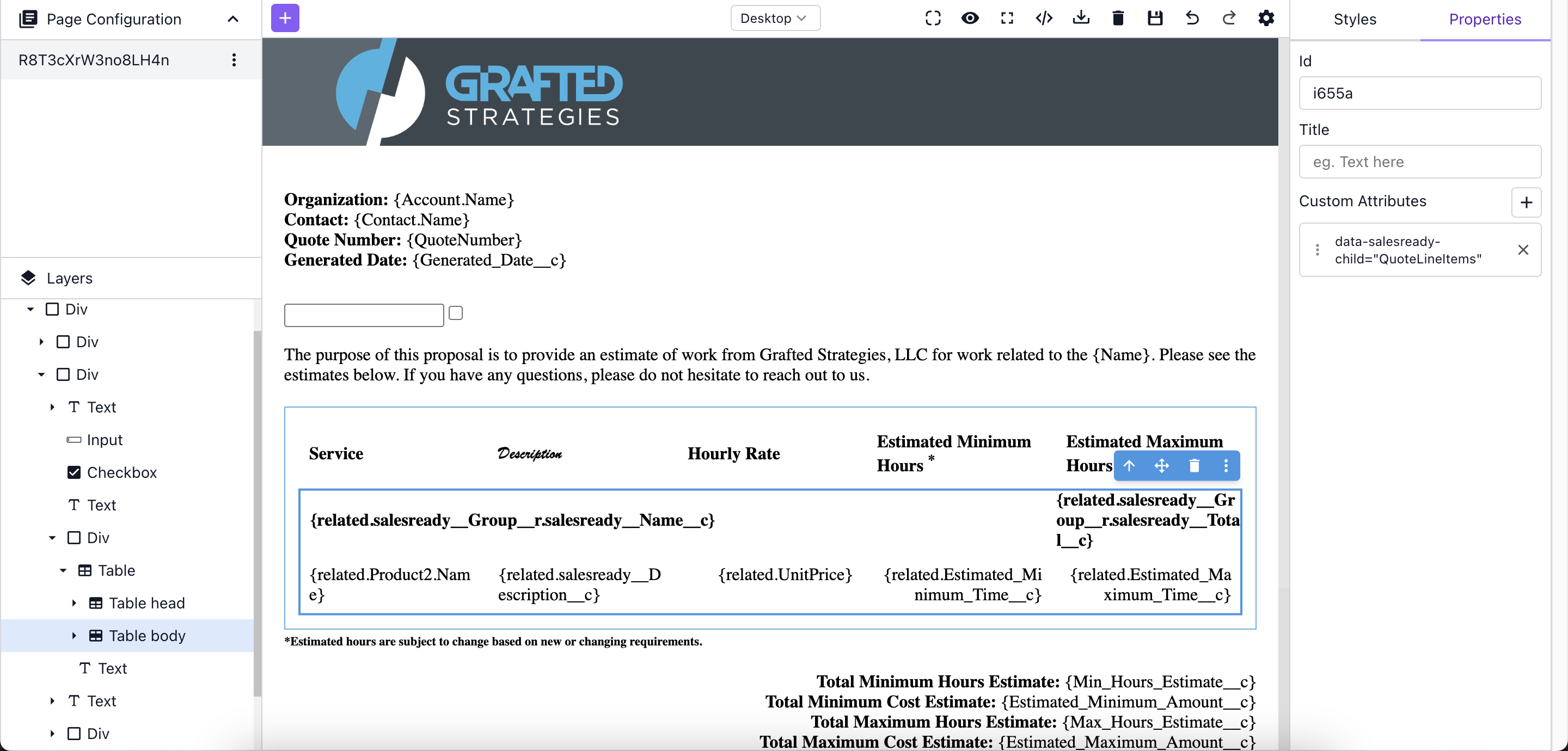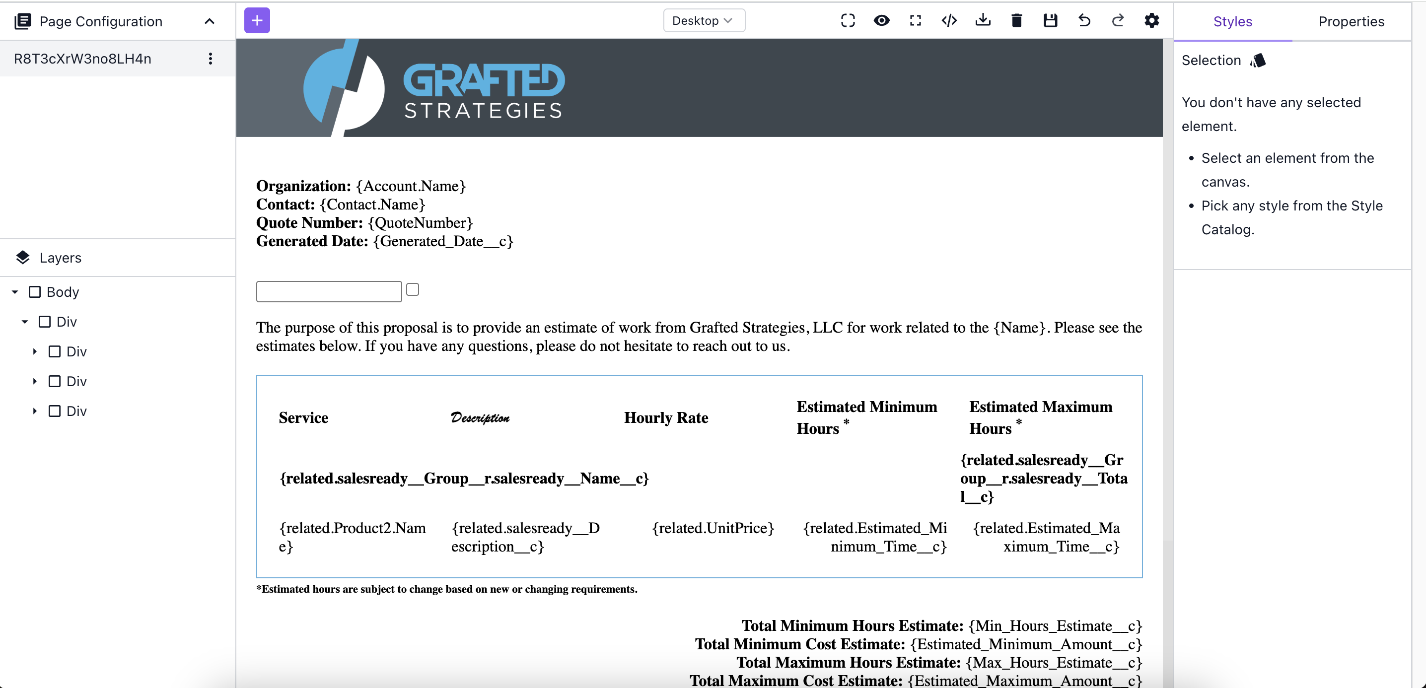 The SalesReady template builder is built on GrapesJS, which is a drag-and-drop builder that uses modern web design to create visually appealing templates. You can access their playground if you would like to try it out beforehand - https://app.grapesjs.com/studio.