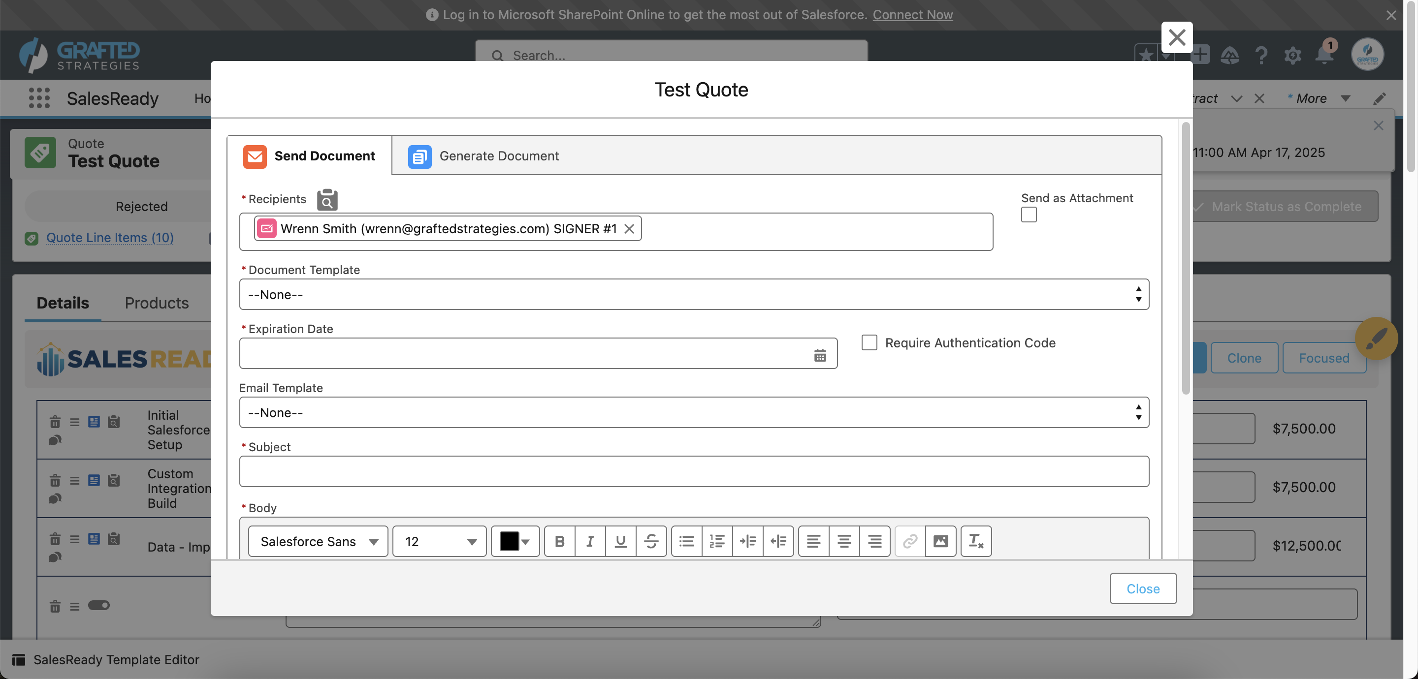 SalesReady E-Signature is built on an external web application hosted on Azure App Service. The template you create using your template editor is embedded in our web app, and sent to signers or recipients from Salesforce via unique links.