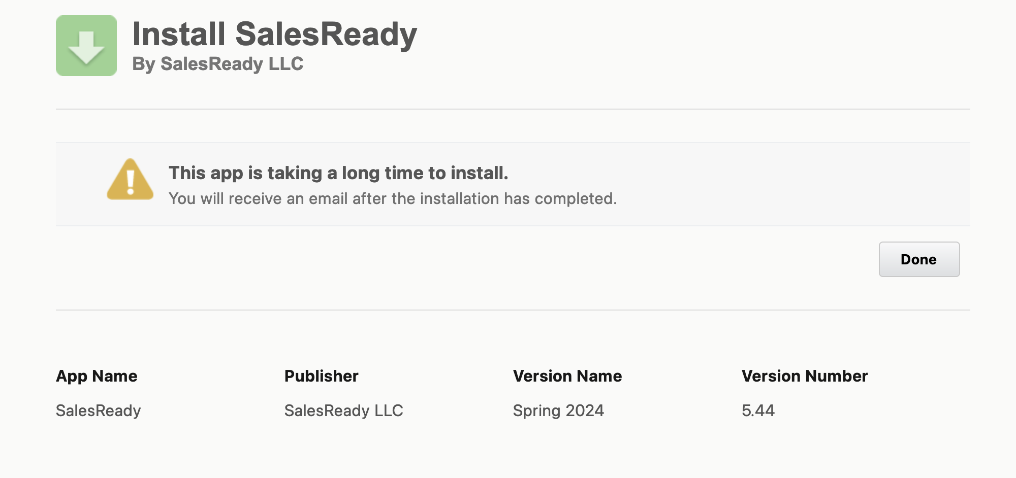 You may or may not receive the following prompt notifying that the app is taking a long time to install. This is not unexpected and you can click “Done” and you will be taken to the “Installed Apps” interface of your Salesforce org.