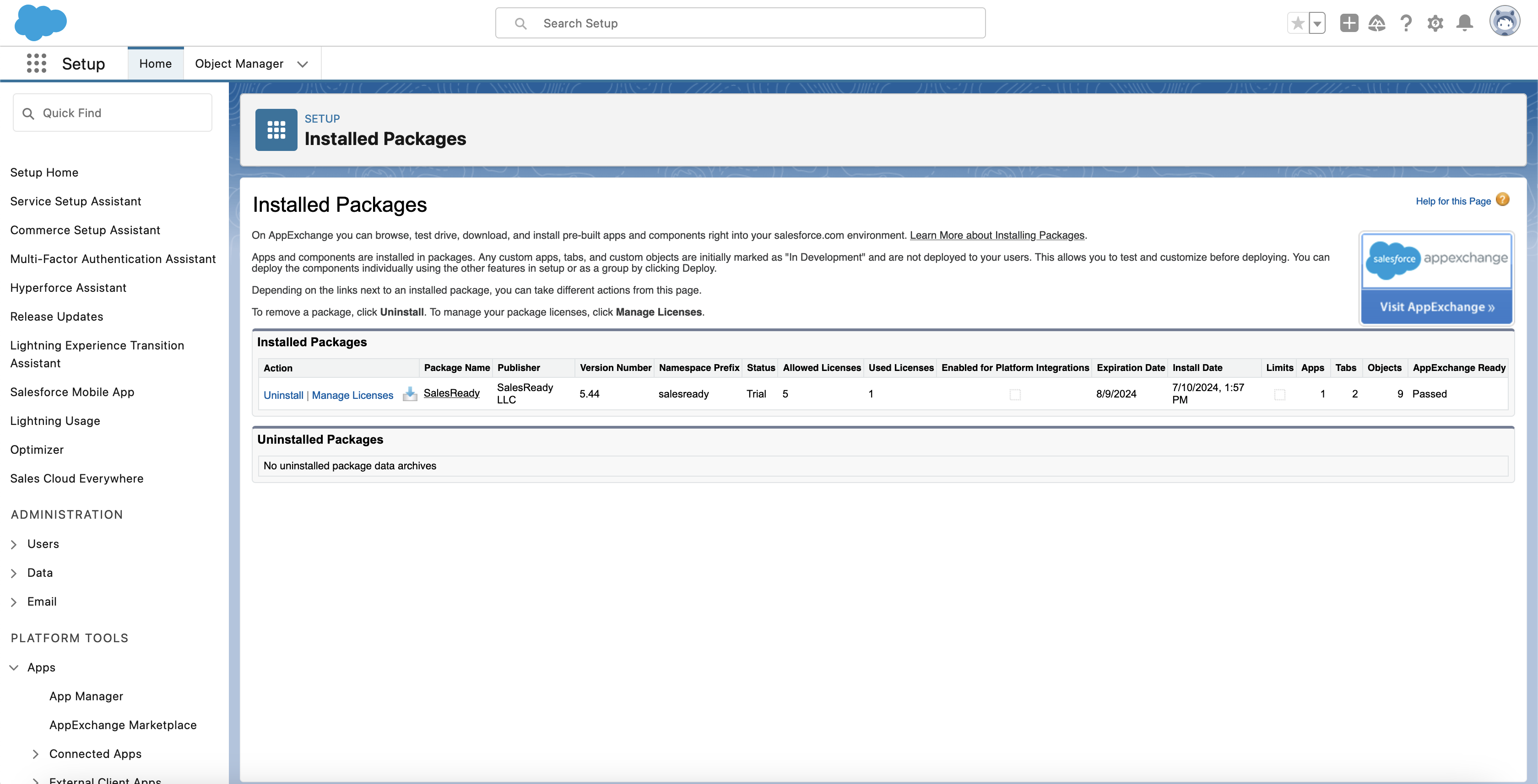 When the installation is finished, you will see SalesReady in the “Installed Apps” interface of your Salesforce org. You may need to refresh the page in order to see the app once you have received the notification email.